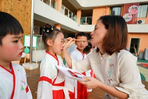 2023年6月27日,在四川省华蓥市杜家坪幼儿园举办的“礼韵国风·雅颂童年”为主题的毕业典礼上,大班的小朋友在接受点朱砂、启童智。