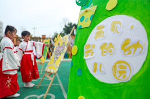 2023年6月27日,在四川省华蓥市杜家坪幼儿园举办的“礼韵国风·雅颂童年”为主题的毕业典礼上,大班的小朋友从启智门走出。