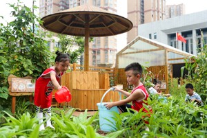 2023年6月27日,在四川省华蓥市杜家坪幼儿园举办的“礼韵国风·雅颂童年”为主题的毕业典礼上,大班的小朋友在给他们的小菜园浇灌最后一次水。