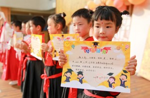 2023年6月27日,在四川省华蓥市杜家坪幼儿园举办的“礼韵国风·雅颂童年”为主题的毕业典礼上,大班的小朋友在展示自己的毕业证书。