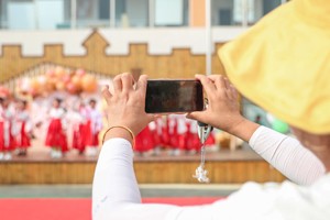 2023年6月27日,在四川省华蓥市杜家坪幼儿园举办的“礼韵国风·雅颂童年”为主题的毕业典礼上,一位家长在用手机给表演才艺的孩子拍照留念。 (邱海鹰 刘晓娟)