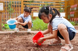 2023年9月1日,四川省华蓥市杜家坪幼儿园的小朋友在小菜园给刚播下的秋菜种子浇水,学习秋种秋播等农事,上好开学第一课。