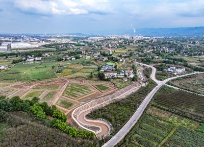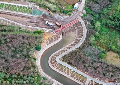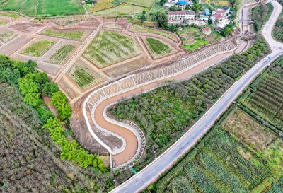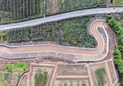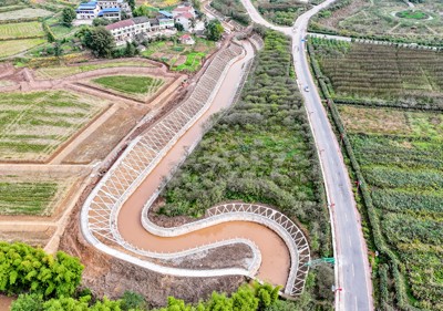 2024年11月14日,鸟瞰四川省华蓥市禄市镇凉水井村即将全面竣工的溪河治理工程。(邱海鹰/文图)