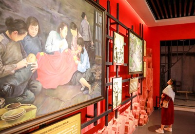 在川渝两地开展的“深入生活,扎根人民”主题采风活动中,一名女作家在华蓥市禄市镇的“三红”广场展厅追思“红岩”英烈。