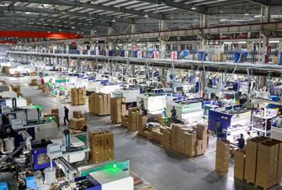 2024年11月20日,四川省广安华蓥市华蓥山经开区瀚海精密电子厂的的员工,在智能车间转运包装好的产品,加速度冲刺全年目标。(邱海鹰)