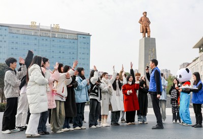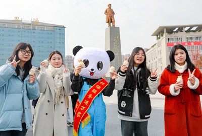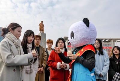 2024年11月22日,四川省市社会保险局的“社保蓝”义务宣传员“熊猫卡通”,在广安职业技术学院与学生互动。