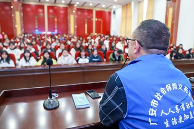 2024年11月22日,四川省广安市社会保险局的“社保蓝”义务宣传员,走向广安职业技术学院向学生宣讲社保知识。(邱海鹰)