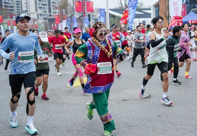 2024年11月23日,四川省广安市一位身穿“喜红娘”服装的市民在加2024马拉松欢乐跑。