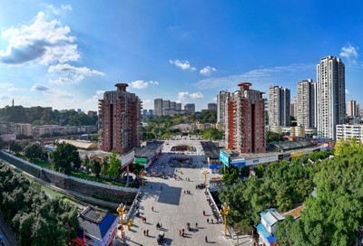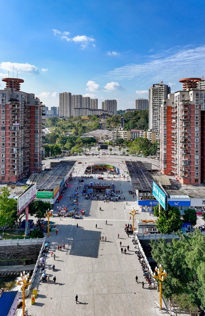 2024年11月27日,鸟瞰四川省华蓥市蓥城提质改造升级工程基本竣工的华蓥山广场一角。
