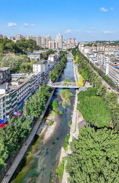 2024年11月27日,鸟瞰四川省华蓥市蓥城提质改造升级工程基本竣工的清溪河及滨河公园。