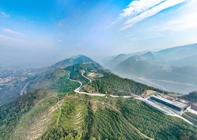 2024年12月18日,鸟瞰四川省华蓥市在退矿复垦地和荒山荒坡发展起来的集生产、加工、产品展示于一体的综合型产业基地——华龙街道柏木山油樟产业园。
