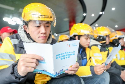 2024年12月20日,四川省广安市美团等新业态从业人员,在医疗志愿者的指导下学习体验工伤预防与救助等知识。(邱海鹰)