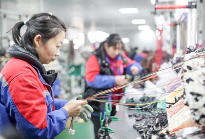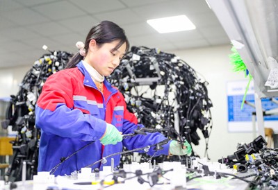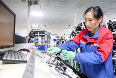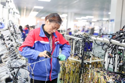 2024年12月27日,在四川省华蓥市华蓥山经开区民营企业大千电子厂的线束车间,工人正在对线束进行电检作业。(邱海鹰)