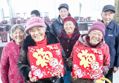 2025年1月15日,四川省华蓥市永兴镇马架坪村的困难群众,在开心中展示爱心人士为他们送来的“福”字门贴。