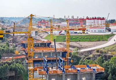 2025年2月8日,在四川省广安华蓥市明月镇境内由中铁十局承建的西渝高铁广安东站制梁场四线桥施工现场,建设者正在桥墩上紧张作业。