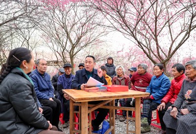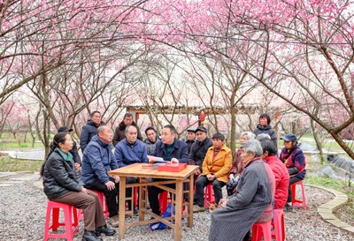 2025年2月11日, 四川省华蓥市禄市镇凉水井村的法律顾问胡平(中)与该村的许永平等“法律明白人”,在村头的生态园组织业主和务工村民学习相关法律知识。