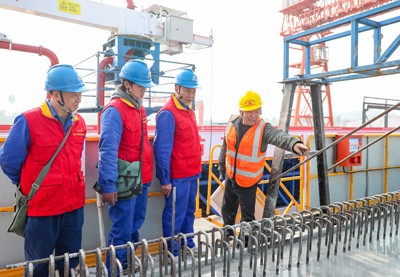2025年2月25日,国家电网四川省广安华蓥市供电公司的电力志愿者,奔忙在国家重点工程西渝高铁广安东站制梁场施工现场,了解生产用电情况。(邱海鹰 张 凤)