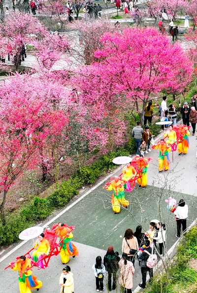 图为2025年3月1日,民间艺人在四川省广安华蓥市禄市镇凉水井村灼灼其华的梅花丛中,为欢度周末的市民展演国家级非遗“华蓥山滑竿抬幺妹”。(邱海鹰 刘南贤)
