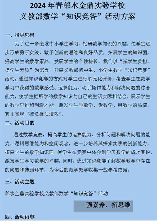 活动之初,义教部数学组制定了周密的《数学“知识竞答”活动方案》,从指导思想、活动目的、活动内容及流程等方面做了详细布局设计。