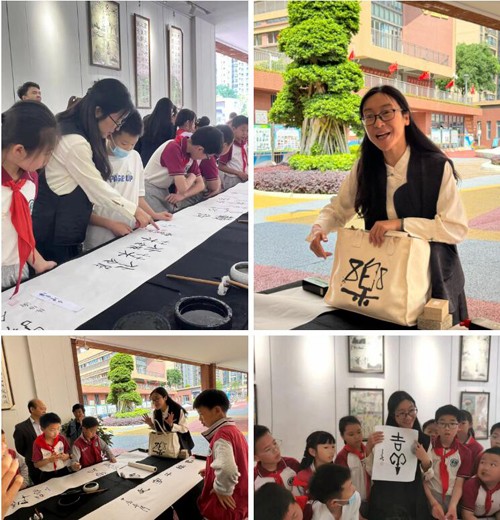 活动最后,王老师拿起毛笔,书写并展示了甲骨文“吉祥”二字,字迹飘逸、古朴。王老师为每一幅作品题名并郑重地落章,笔尖流露出的不仅是书法的韵律,更是中华文化的深沉内涵。王老师以亲和易懂的语言为孩子们讲解书法的奥妙,让孩子们对这门古老的艺术心生向往,仿佛在心中埋下了一颗书法的种子。