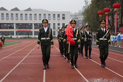 活动在慷慨激昂鼓舞《金蛇献瑞》中拉开帷幕,学生们在家长的陪伴下迈着坚定的步伐跨过成人门。国旗队迈着整齐有力的步伐护送国旗入场,在激昂的国歌声中,全体师生庄严肃立,注视着五星红旗冉冉升起。