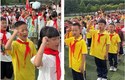“我是中国少年先锋队队员。我在队旗下宣誓:我热爱中国共产党,热爱祖国,……”新队员们高举右拳,在队旗下庄严宣誓。稚嫩而坚定的声音响彻校园,这是他们对组织的承诺,更是对未来的庄严宣告。每一句誓言,都表达了他们立志成为社会主义建设者和接班人的决心。