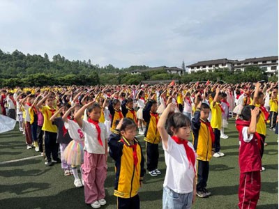 大队辅导员李老师带领少先队员呼号。洪亮的声音响彻校园,这股力量凝聚成对未来的呼声,激励着每位少先队员坚定前行。