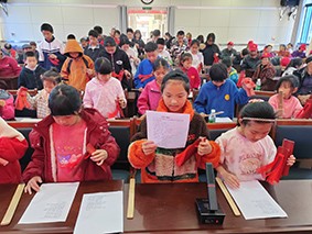 会前,老科协分会五老“志愿者”省级文旅能人罗在荣担任“刮打板”启蒙教师,让传统曲艺在娃娃心中生根,“哒哒哒、哒、哒”,一阵清脆响亮节奏,明快的竹板声伴随稚嫩的童声此起彼伏,“五老”志愿者精神矍铄的正手把手地教孩子们手持竹板,击打节拍,会场内孩子们瞪大眼睛,学得有模有样。这是玄滩镇关工委组织的“非遗传承从娃娃抓起”生动场景,由“五老”志愿者担任启蒙老师,教授地方特色“曲艺”刮打板。将持续在暑期、春节前后组织孩子们开展传授“刮打板”练习活动。