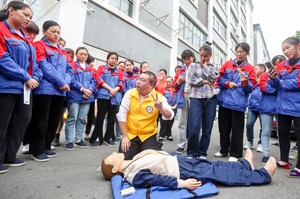 2023年11月10日,四川省广安市华蓥山经开区大千电子科技有限公司的务工人员在体验应急救助,提升工伤预防技能。
