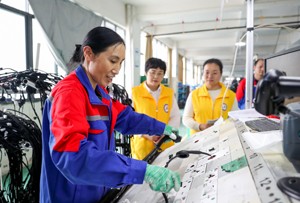2023年11月10日,四川省广安市华蓥山经开区大千电子科技有限公司的务工人员,在领取该市社会保险局免费发放的劳动安全防护用品。(邱海鹰)