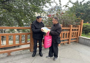 志愿者向老年人发送宣传资料,讲解艾滋病的危害