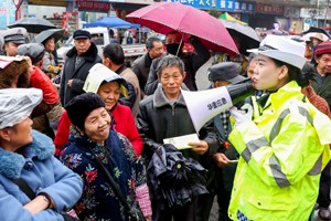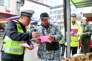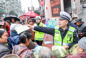 2023年12月1日,四川省广安市公安局交通警察支队、华蓥市公安局交通警察大队和华蓥市应急管理局联合组织的“美丽乡村行”宣讲小分队,冒着寒冷在高兴镇向赶场的群众宣讲交通安全知识并发放宣传资料。(邱海鹰 摄影报道)
