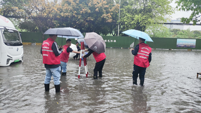 战旗红志愿者协助社区两委工作人员查看道路被淹情况