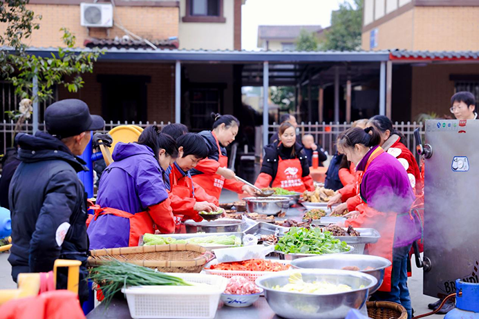 活动当天上午,由居民自主组建的五大专项小组早已各就各位。美厨娘志愿队负责人再次强调了现场分工与安全须知,为大家发放手套、口罩、袖套等劳保用品后,各小组迅速投入工作。小区内红灯笼点缀其间,年味十足,志愿者们忙碌而有序:临时厨房操作区里,大家各展厨艺,糖醋排骨、腊味拼盘、家常烧菜等一道道风味各异的佳肴陆续出锅,香气弥漫整个小区;菜品展示区中,菜肴整齐排列,琳琅满目,引得居民们驻足称赞;现场服务组凭定制入场券引导大家有序就座,后勤保障组及时补充抽纸、湿纸巾等物品,让每一位参与者都能舒心用餐。