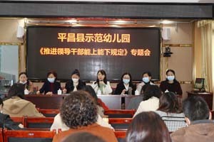近日,平昌县示范幼儿园分别组织召开园支委会、行政班子扩大会、教职工会议,传达学习《推进领导干部能上能下规定》文件精神,研究贯彻落实意见,安排部署监督教育教学管理工作。