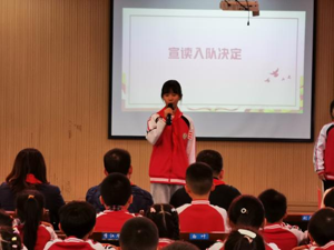 二年级(3)班陈舒航同学代表全体新队员表达了此刻激动而幸福的心情,在仪式上表下决心,传递出成为一名光荣的少先队员的自豪,为少先队增光添彩的决心。他表示一定发扬少先队的光荣传统,并努力将自己锻炼成敢于拼搏,乐观向上的一代新人。二(5)班周晨曦同学则代表老队员对新队员的入队表示欢迎,期待新队员能够更加严格要求自己,为少先队组织贡献力量,并希望新队员能够跟随老队员的步伐,发奋学习,努力争做一名优秀的少先队员。学校党支部书记洪艳老师对新队员表示祝贺,希望大家践行少先队员的使命,热爱祖国、勤奋学习,用实际行动为红领巾增光添彩!然后洪艳老师引领新队员在队旗下呼号——“准备着为共产主义事业而奋斗”,“时刻准备着!”豪迈的呼号声响彻会场。