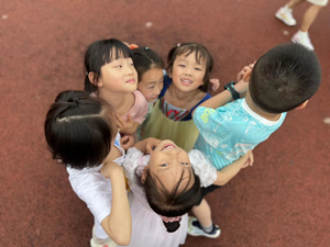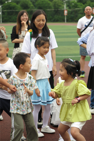 最考验大朋友的引导和小朋友的信任与协作的,无疑在“桃花朵朵开”的问答、组合场。首先圈儿要围得又大又圆,当然,回答“开几朵”时,若能又快又准地回复所报数字,还能不多不少地组合,那肯定是全场最帅气的仔!