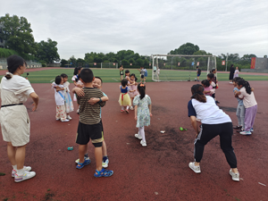 上午的活动主要为团辅类,包括萝卜蹲、大风吹、桃花朵朵开等游戏。现在,我们往这边瞧瞧,几个小组在一起一蹲间已闹闹热热了起来,原来大小朋友在玩“萝卜蹲”。“白萝卜蹲,白萝卜蹲,白卜蹲完红萝卜蹲。”大、小朋友们一边麻溜蹲起一边小心念着,一边提防自己失误一边又盼望对手犯错。一轮轮转下来,免不了有“倒霉蛋儿”笑着被淘汰。
