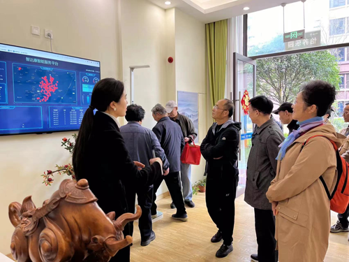 新都区老科协一行兴致勃勃地参观了小区的智慧指挥中心、紧急呼叫系统、儿童之家、邻里之家、悦享空间、怡养乐园、共享菜园、幸福餐厅、运动休闲区、地下智能停车场。