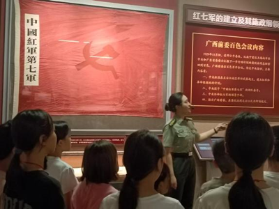 始建于1961年,建筑面积达5500平方米的白色起义纪念馆,庄严肃穆,大气辉煌,充分运用了现代光、电、多媒体,结合壁画和油画、雕塑幻影成像为一体,给人耳目一新的感觉。馆内主题以1925年邓小平、张云逸、韦拔群为领导红军第七军红色革命活动为主线,展示了《起义烽火》《苏区建设》《永放光芒》《浩气长存》《璀璨群星》《伟人足迹》六大部分,随着讲解员的脚步,我们边听边看,孙女还不断提问,邓爷爷他们在如此艰苦的条件还要发动群众搞武装起义?讲解阿姨耐心的回答到:是为了打倒反动派、推翻压在中国人民头上的三座大山,解放全中国啊!听后孙女很感动的说:“他们真伟大,很值得我们一代代后人学习!”讲解员又说:“当年,年仅25岁的邓小平爷爷受中央委派,义不容辞的来到广西百色地区,领导开展了伟大的百色起义运动,此举为华东及全国的解放打下了坚实的基础,你们今天不远千里来到此地学习,传承中国革命传统,就是要把老一辈革命红色血脉一代代传承下去,用他们忘我的革命精神,锻炼自己,发奋努力,把我们伟大的祖国建设得更加美好!”我们三代人不谋而合的连忙点头称是。这就达到了我们不虚此行的真正目的。