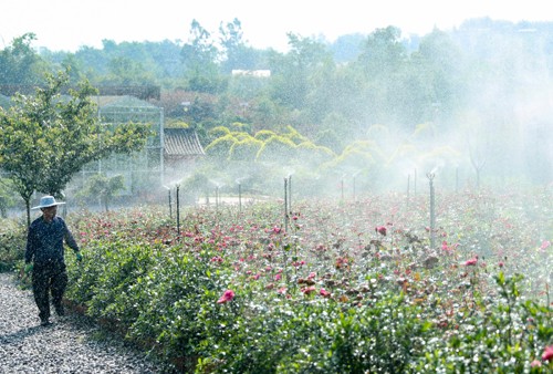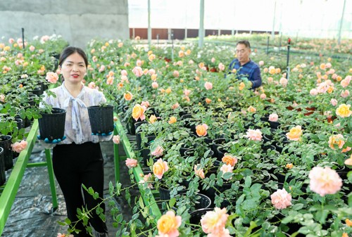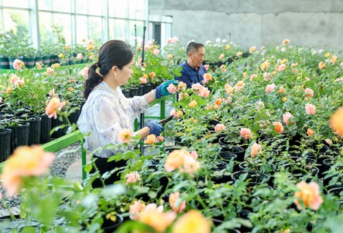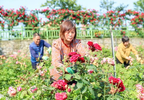 连日来,四川省华蓥市禄市镇凉水井村生态园的花农奔忙玫瑰园,为相继绽放的玫瑰修枝、造型、浇水,精心培育节日花卉产品,迎接在五一劳动节休假的市民前往观赏和选购。近年来,凉水井村因地制宜,引进业主发展玫瑰、海棠、紫薇等特色花木,有效带动乡村经济发展,进一步推动乡村全面振兴。