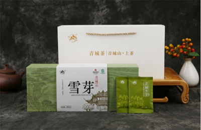 “青城山雪芽”牌绿茶:青城山雪芽历史悠久、源远流长。自东汉汉安元年(公元142年)张道陵创立道教两千多年来,道家崇尚“人法地,地法天,天法道,道法自然”,尤重“茶之功”,青城山种茶、制茶、饮茶风气的形成源于赐茶之风。1958年青城雪芽被评为“四川省名茶产品”;1985年5月青城雪芽获评“四川省优质名茶”。