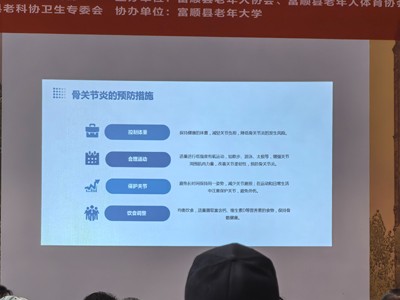随后,朱桃玉围绕《骨关节炎的预防及治疗》,就骨关节炎的病因和发病机制、临床表现和特征、骨关节炎的患者管理和预防措施等作了讲解。同时,着重强调了科学、简便、安全的有效运动训练在预防和治疗骨关节炎中的重要作用,并分享了在家里就能进行的康复训练方法。