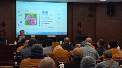 2024 年 12 月 12 日,市规划和自然资源局老科协分会的老科技工作者、市老科协牡丹文化专委会副主任杨礼通,走进彭州市委统战部培训中心会场,为彭州市各宗教寺庙的负责人举行了一场牡丹知识的交流培训。