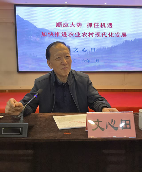 文心田教授以《顺应大势 抓住机遇 加快推进农业农村现代化发展》为主题,从“学习中央重要会议精神”、“学习省委省政府发表的《建设新时代更高水平“天府粮仓”行动方案》”、“关于现代农业发展”等三大主题对中央一号文件进行了解读。文教授强调发展现代农业的路径就是要构建现代农业产业体系、生产体系、经营体系;要发展优势特色产业,保障粮食安全、做好“土特产”文章;现代农业必须是依靠科技发展的农业,生产过程必须是可知可控的、可溯源的、高效的;要按照现代农业发展方向,实现规模化、标准化、商品化、品牌化;要优选新型农业经营主体、实现小农户和现代农业发展有机衔接,要选好乡村振兴发展带头人;现代农业要加强农工商结合、农文旅结合,实现一二三产业融合发展。文心田教授言简意赅、深入浅出的讲解,受到与会人员高度赞誉。大家一致认为,中央一号文件进一步凸显了农业农村现代化在中国式现代化进程中的战略地位,为做好全年“三农”工作指明了方向。通过学习,我们更加清晰地把握了推进乡村全面振兴的目标导向、任务要求和实践路径。大家纷纷表示要持续发挥专业所长,融入新津乡村建设当中。