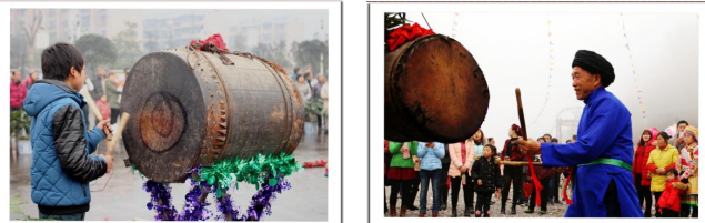 击鼓是击的大牛皮鼓,牛皮鼓是绑在鼓架上,鼓架是固定在堂屋中间的一根竖立楠竹,鼓面中心离地面约1.8米左右,便于击鼓人敲打。牛皮鼓不像晋南的“威风锣鼓”那样肥大和扁平。也不像川剧用的传统鼓那样小巧和瘦长,形状和大小介于二者之间。其中,川戏用的鼓面直径不足20厘米,苗族人用的鼓面直径起码有40厘米。大牛皮鼓的桶子是木料制作保持本来面目没有漆过。鼓面的牛皮是凉干没经过特殊处理直接绷上去的,显得做工比较粗糙,但特别扎实耐用,用小木棒咋敲都打不烂,大牛皮鼓应该是当地手工制作。
