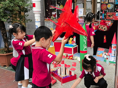 活动现场特设“亲子爱国主题手工展”区域,成为传递爱国情感的又一亮点。此前,家长与孩子共同围绕“祖国”主题创作手工:有的用彩纸剪贴出“五星红旗”,边角仔细折叠出整齐的纹路;有的用黏土捏制“天安门”“长城”,细节处尽显巧思;还有的将废旧材料改造为“小火箭”“军舰”,既环保又充满对祖国科技发展的自豪。