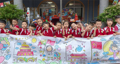 活动最后,“绘祖国·庆中秋”10米长卷创作成为连接爱国情怀与传统节日的纽带。孩子们手持画笔,在长卷上自由创作:有的画出“天安门上挂灯笼”,将国庆的庄重与中秋的喜庆结合;有的描绘“月亮下的五星红旗”,用画笔诉说对祖国的美好祝愿。活动尾声,全体师幼在长卷前合影,一张张笑脸与鲜红的国旗、多彩的画作相映,定格下这个充满爱国情怀的温馨瞬间。