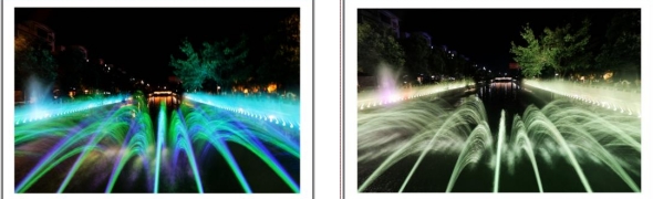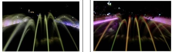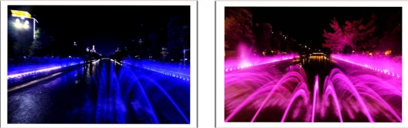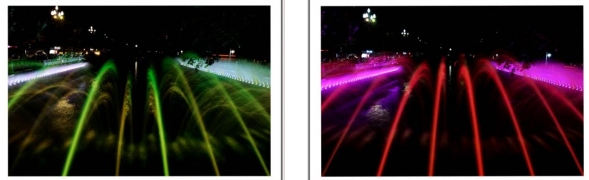 伴随着优美的音乐和变化的灯光一簇簇水花也变换着颜色