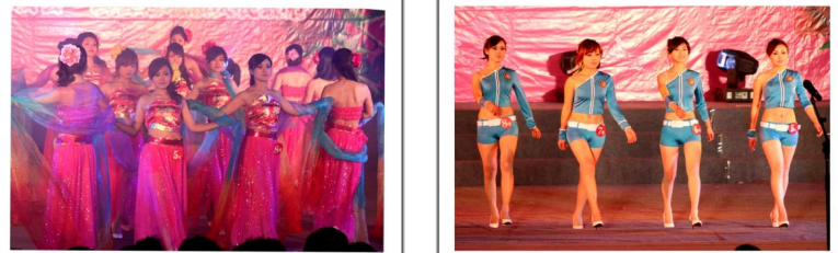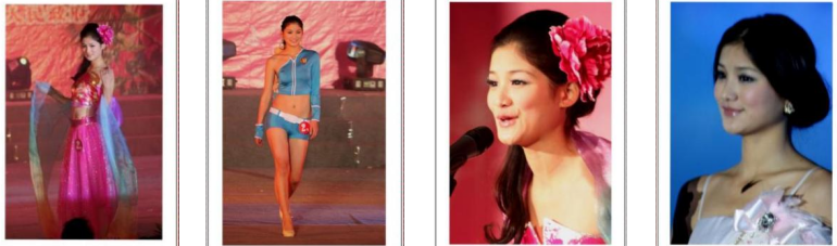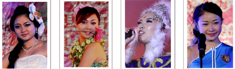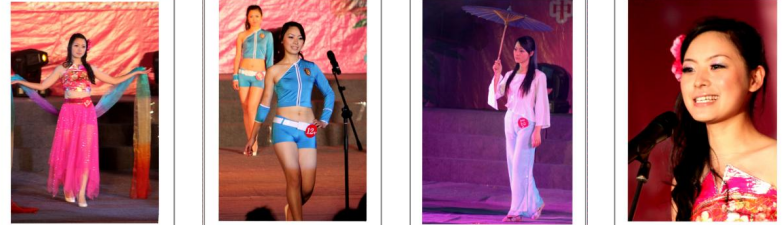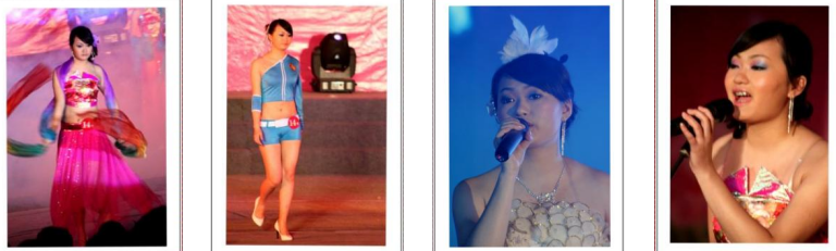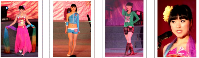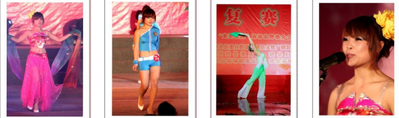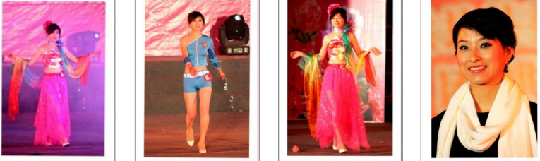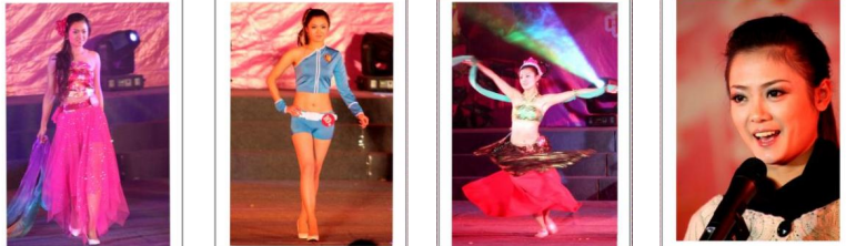 图(1)→主持人罗君(左)、谭丽莎(右); 图(2)→茶花仙子叶平(最佳聪慧) ;图(3)→茶花仙子程雪(最佳形象) ;图(4)→茶花仙子何蝉(最佳才艺) 。